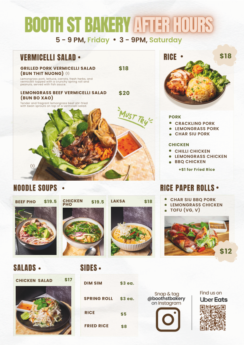 In conclusion, Booth Street Bakery’s menu is a vibrant mix of fresh, flavorful, and satisfying options. Whether you're in the mood for something light like the vermicelli salads and rice paper rolls, or a hearty noodle soup or rice dish, there's something for everyone. With a great balance of flavors and textures, this menu ensures a memorable dining experience for all.